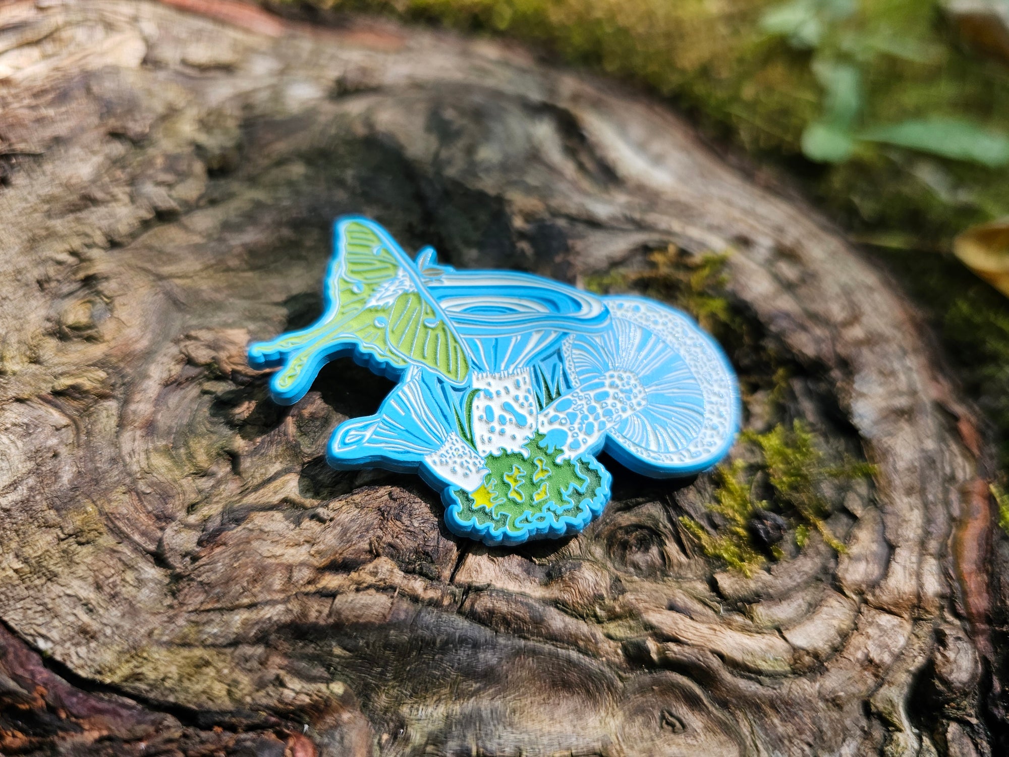 Mythical Mushroom Moth Enamel Pin – Blue Dyed Metal Psychedelic Shroom Nature Art